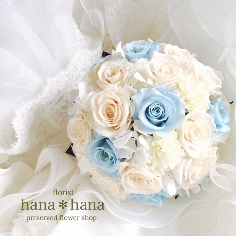 プリザーブドフラワーだからこそできる、ブルーのバラのウエディングブーケ…