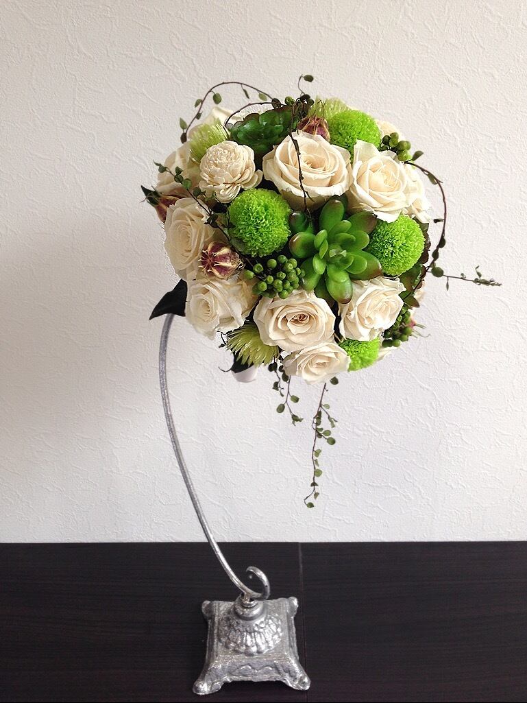【花材】バラ,ピンポンマム,シルバーデージー,フウセンポピー,ペッパーベリー,アイビー,ワイヤープランツ,多肉植物(アート)