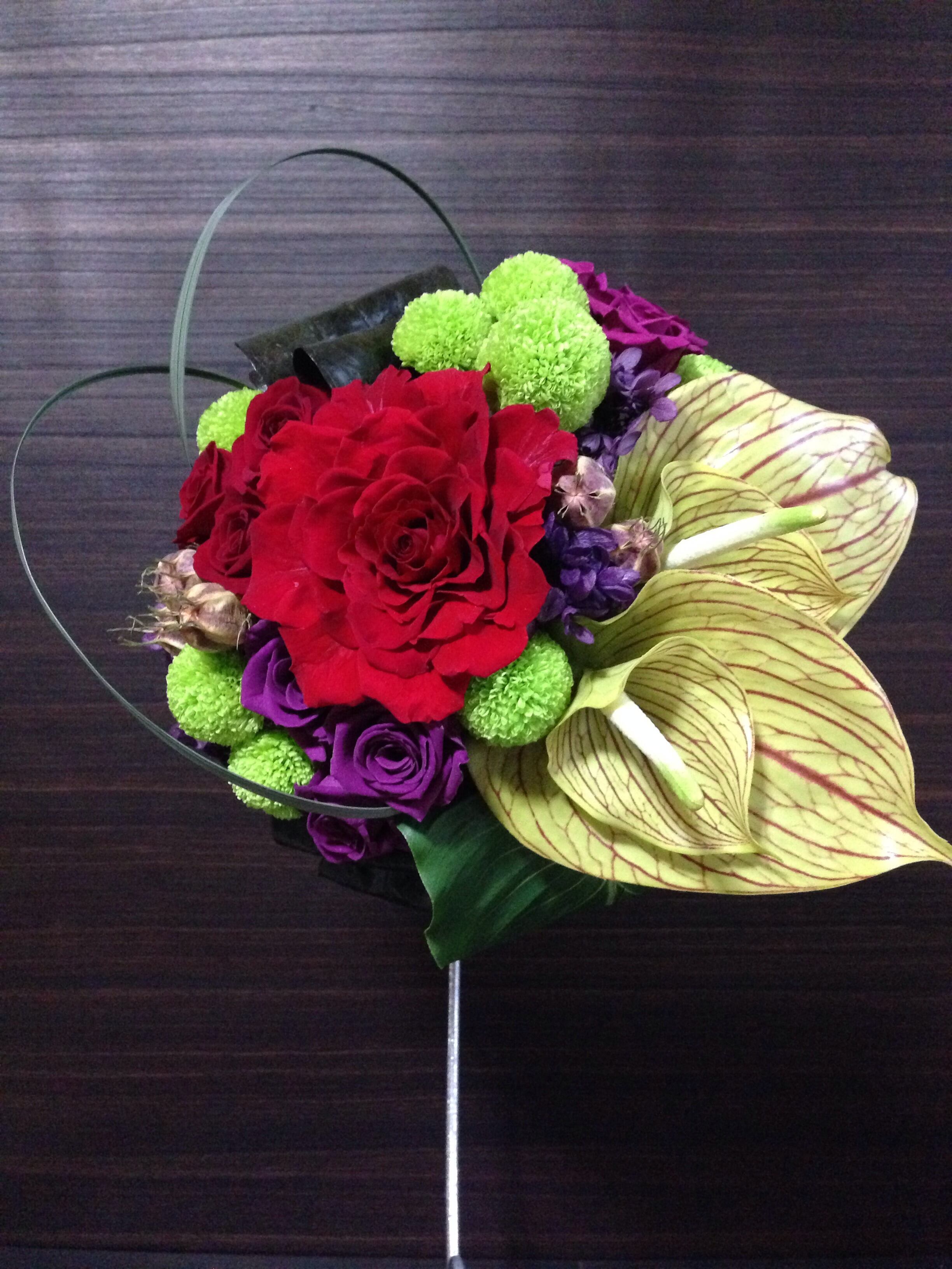 【花材】バラ,ピンポンマム,アンスリュウム(アート),フウセンポピー,アジサイ,ミスカンサス