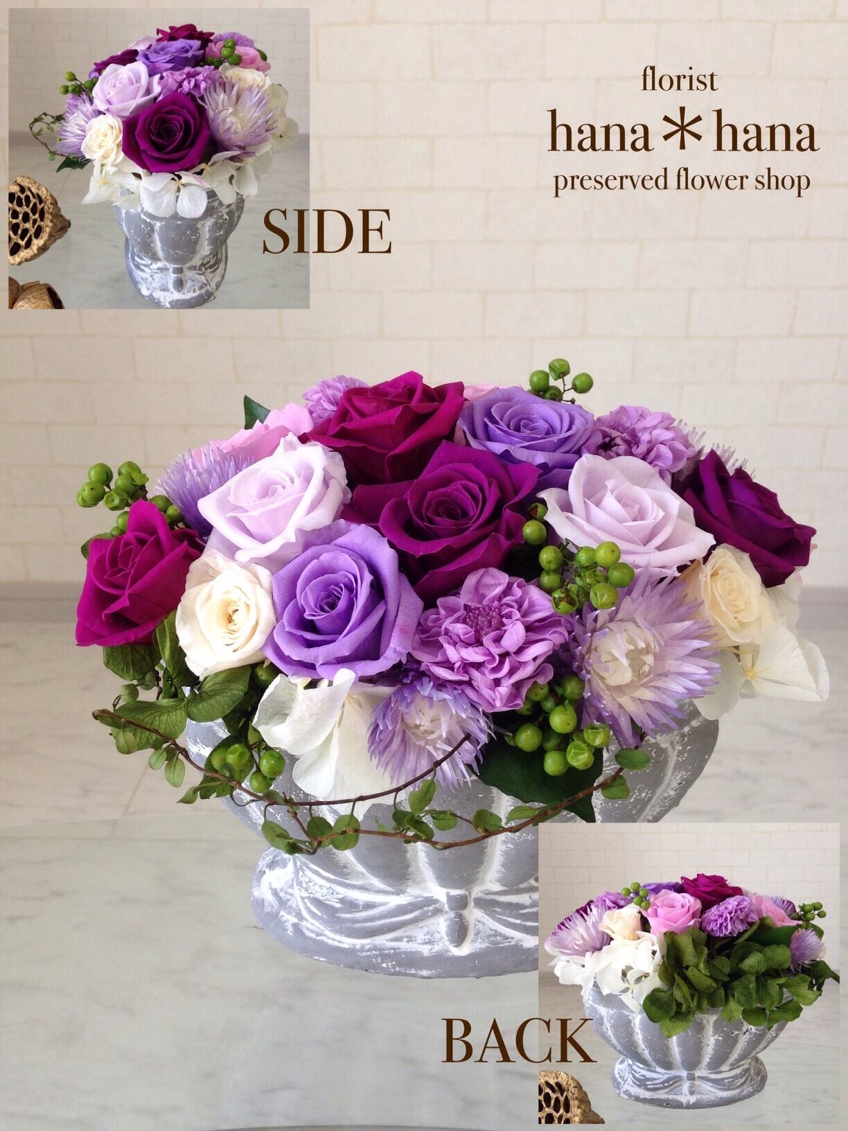 こちらの商品「シャルモン」は紫色のお花のグラデーションとアンティーク風の陶器の器で大人っぽくアレンジしました。